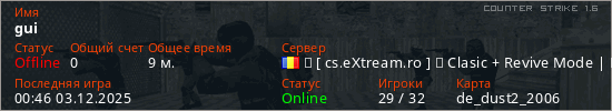 Играет на Counter Strike 1.6 сервере. Страна: РумынияПервый раз замечен 05:29 23.07.2025