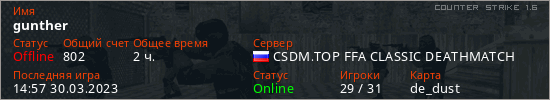Играет на Counter Strike 1.6 сервере. Страна: РоссияПервый раз замечен 15:28 16.03.2022