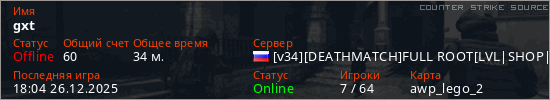 Играет на Counter Strike Source сервере. Страна: РоссияПервый раз замечен 19:02 31.08.2025