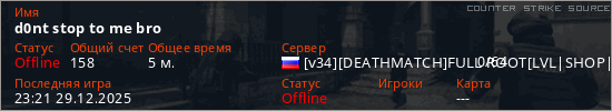 Играет на Counter Strike Source сервере. Страна: РоссияПервый раз замечен 23:19 29.12.2025