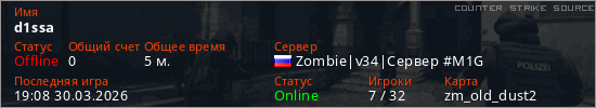 Играет на Counter Strike Source сервере. Страна: РоссияПервый раз замечен 19:06 30.03.2026