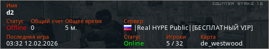 Играет на Counter Strike 1.6 сервере. Страна: РоссияПервый раз замечен 02:59 12.02.2026