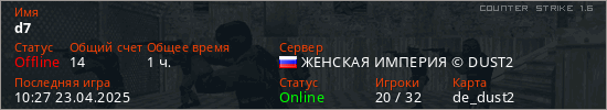 Играет на Counter Strike 1.6 сервере. Страна: РоссияПервый раз замечен 10:12 08.04.2025