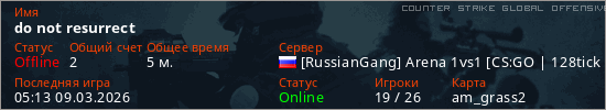 Играет на Counter Strike Global Offensive сервере. Страна: РоссияПервый раз замечен 04:50 09.03.2026