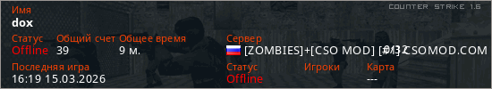 Играет на Counter Strike 1.6 сервере. Страна: РоссияПервый раз замечен 16:34 11.03.2026