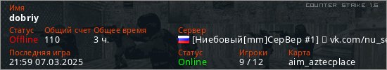 Играет на Counter Strike 1.6 сервере. Страна: РоссияПервый раз замечен 22:43 18.02.2025