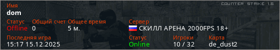 Играет на Counter Strike 1.6 сервере. Страна: РоссияПервый раз замечен 14:51 15.12.2025
