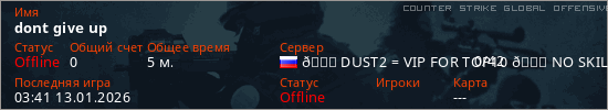 Играет на Counter Strike Global Offensive сервере. Страна: РоссияПервый раз замечен 02:48 13.01.2026