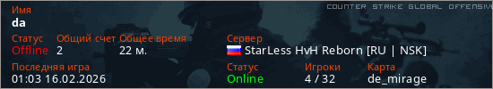 Играет на Counter Strike Global Offensive сервере. Страна: РоссияПервый раз замечен 15:47 10.02.2026