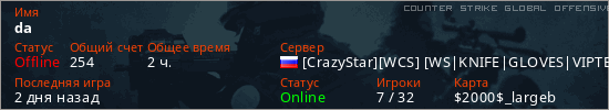 Играет на Counter Strike Global Offensive сервере. Страна: РоссияПервый раз замечен 17:20 06.03.2026