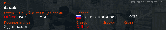 Играет на Counter Strike 1.6 сервере. Страна: РоссияПервый раз замечен 09:38 23.08.2025