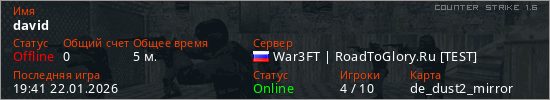 Играет на Counter Strike 1.6 сервере. Страна: РоссияПервый раз замечен 19:35 22.01.2026