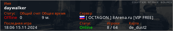 Играет на Counter Strike Source сервере. Страна: РоссияПервый раз замечен 17:21 15.11.2024