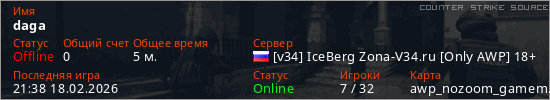 Играет на Counter Strike Source сервере. Страна: РоссияПервый раз замечен 21:28 18.02.2026