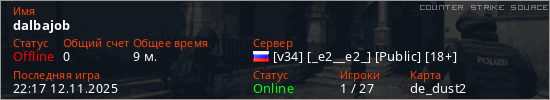 Играет на Counter Strike Source сервере. Страна: РоссияПервый раз замечен 13:49 09.11.2025