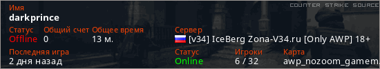Играет на Counter Strike Source сервере. Страна: РоссияПервый раз замечен 19:46 27.12.2025