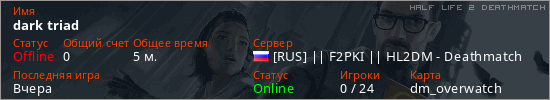 Играет на Half Life 2 DeathMatch сервере. Страна: РоссияПервый раз замечен 20:09 14.02.2026