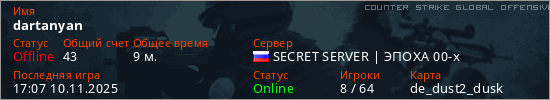 Играет на Counter Strike Global Offensive сервере. Страна: РоссияПервый раз замечен 16:46 10.11.2025