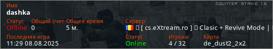 Играет на Counter Strike 1.6 сервере. Страна: РумынияПервый раз замечен 11:27 08.08.2025
