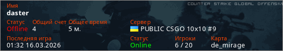 Играет на Counter Strike Global Offensive сервере. Страна: УкраинаПервый раз замечен 23:39 15.03.2026
