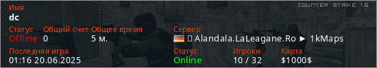 Играет на Counter Strike 1.6 сервере. Страна: ГерманияПервый раз замечен 01:10 20.06.2025