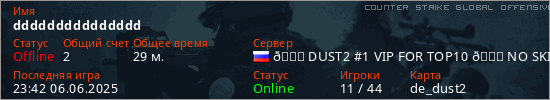 Играет на Counter Strike Global Offensive сервере. Страна: РоссияПервый раз замечен 10:20 27.05.2025