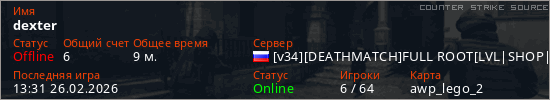 Играет на Counter Strike Source сервере. Страна: РоссияПервый раз замечен 16:42 23.02.2026