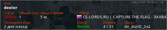 Играет на Counter Strike 1.6 сервере. Страна: РоссияПервый раз замечен 14:54 06.02.2026