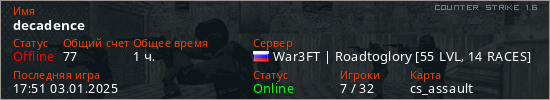 Играет на Counter Strike 1.6 сервере. Страна: РоссияПервый раз замечен 15:22 25.12.2024