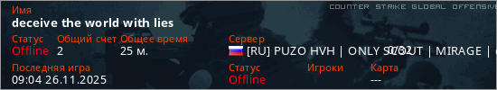 Играет на Counter Strike Global Offensive сервере. Страна: РоссияПервый раз замечен 23:29 14.11.2025