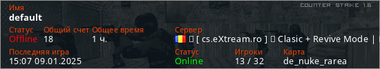 Играет на Counter Strike 1.6 сервере. Страна: РумынияПервый раз замечен 11:07 04.01.2025
