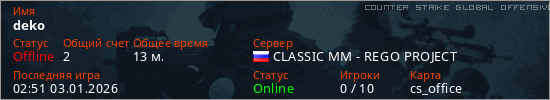 Играет на Counter Strike Global Offensive сервере. Страна: РоссияПервый раз замечен 18:05 01.01.2026