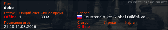 Играет на Counter Strike Source сервере. Страна: РоссияПервый раз замечен 23:05 26.09.2025