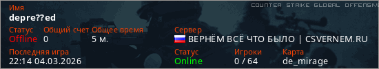 Играет на Counter Strike Global Offensive сервере. Страна: РоссияПервый раз замечен 21:56 04.03.2026