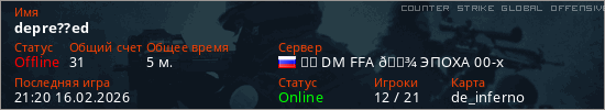 Играет на Counter Strike Global Offensive сервере. Страна: РоссияПервый раз замечен 21:16 16.02.2026