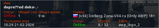Играет на Counter Strike Source сервере. Страна: РоссияПервый раз замечен 09:12 21.02.2026