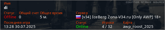 Играет на Counter Strike Source сервере. Страна: РоссияПервый раз замечен 13:16 30.07.2025