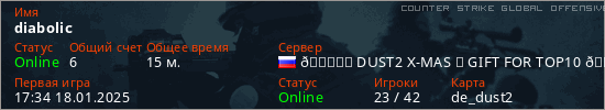 Играет на Counter Strike Global Offensive сервере. Страна: РоссияПервый раз замечен 17:34 18.01.2025