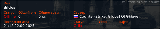 Играет на Counter Strike Source сервере. Страна: РоссияПервый раз замечен 20:45 22.09.2025