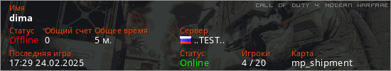 Играет на Call of Duty 4: Modern Warfare сервере. Страна: РоссияПервый раз замечен 17:25 24.02.2025