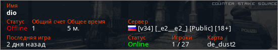 Играет на Counter Strike Source сервере. Страна: РоссияПервый раз замечен 20:09 18.01.2026