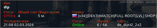Играет на Counter Strike Source сервере. Страна: РоссияПервый раз замечен 21:06 02.03.2026