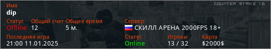 Играет на Counter Strike 1.6 сервере. Страна: РоссияПервый раз замечен 20:50 11.01.2025