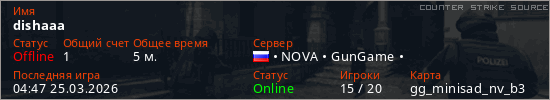 Играет на Counter Strike Source сервере. Страна: РоссияПервый раз замечен 04:45 25.03.2026