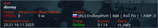 Играет на Counter Strike Global Offensive сервере. Страна: РоссияПервый раз замечен 22:31 16.11.2025