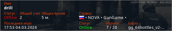 Играет на Counter Strike Source сервере. Страна: РоссияПервый раз замечен 17:49 04.03.2026