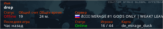Играет на Counter Strike Global Offensive сервере. Страна: РоссияПервый раз замечен 20:34 13.03.2026