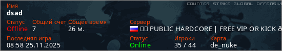 Играет на Counter Strike Global Offensive сервере. Страна: РоссияПервый раз замечен 15:00 12.11.2025
