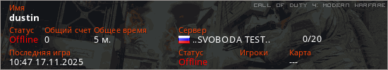 Играет на Call of Duty 4: Modern Warfare сервере. Страна: РоссияПервый раз замечен 10:44 17.11.2025