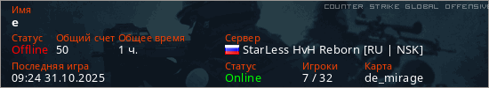 Играет на Counter Strike Global Offensive сервере. Страна: РоссияПервый раз замечен 08:13 26.09.2025